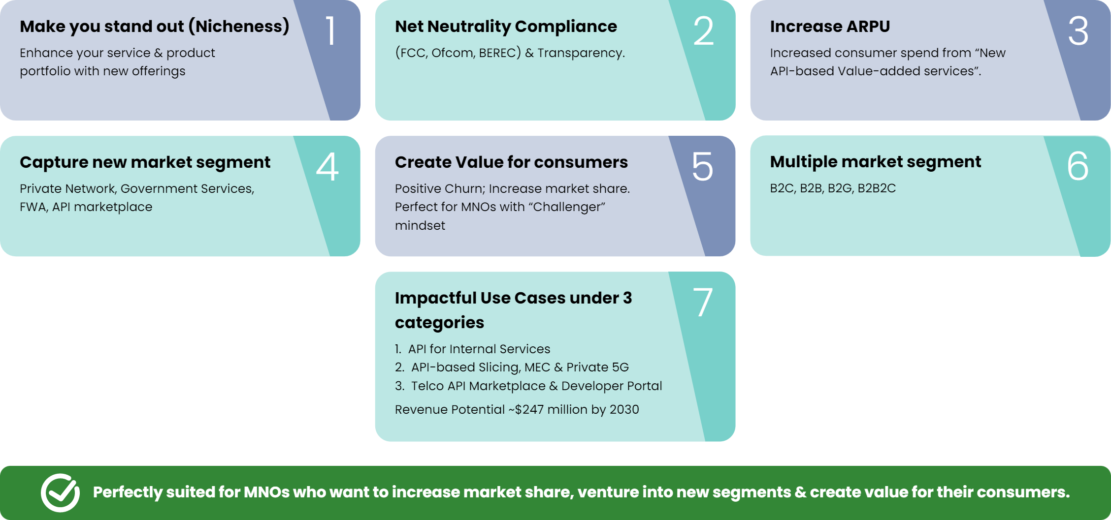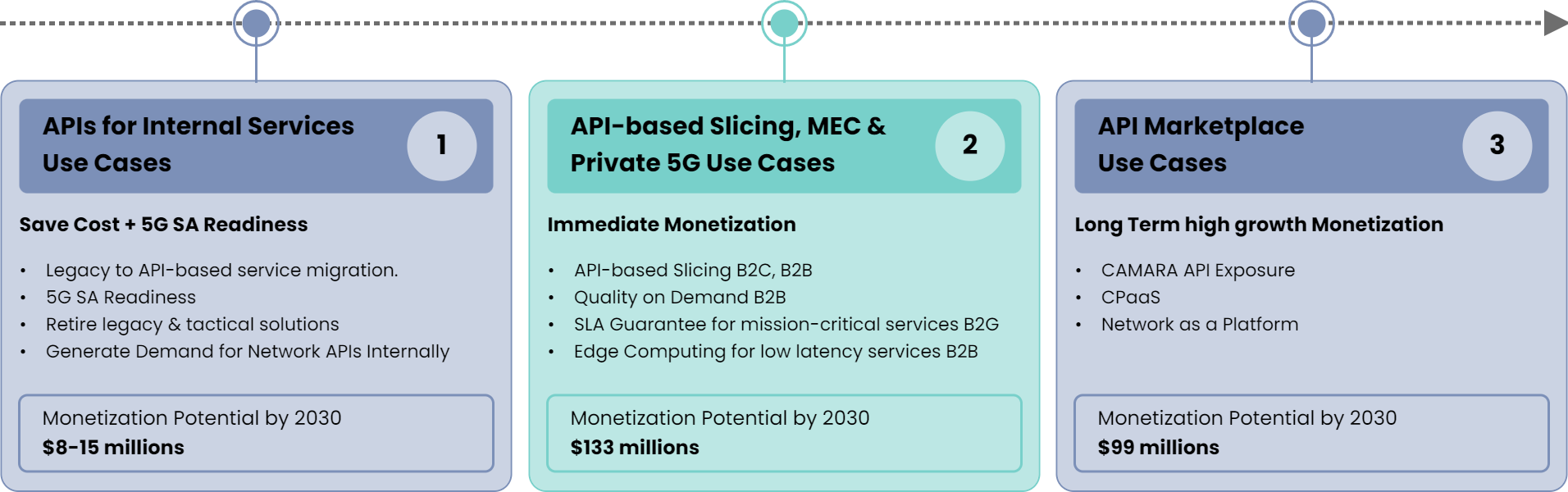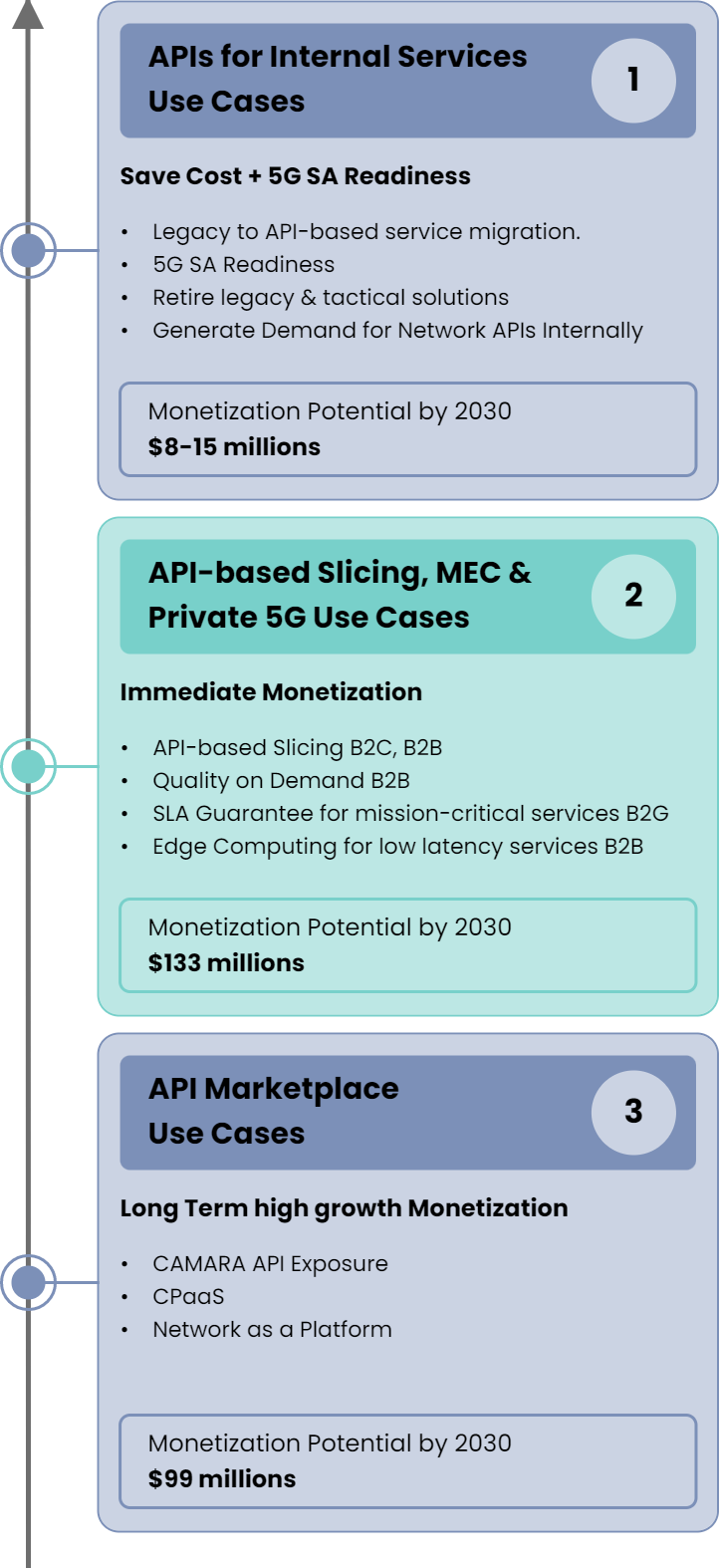 Rather than treating APIs, analytics, and service differentiation as separate projects, SliceFinity unifies them into a single, structured monetization journey. Our approach shows operators exactly how to start with internal efficiencies, evolve into service differentiation, and ultimately scale to external ecosystems—turning APIs into a sustainable engine for growth.