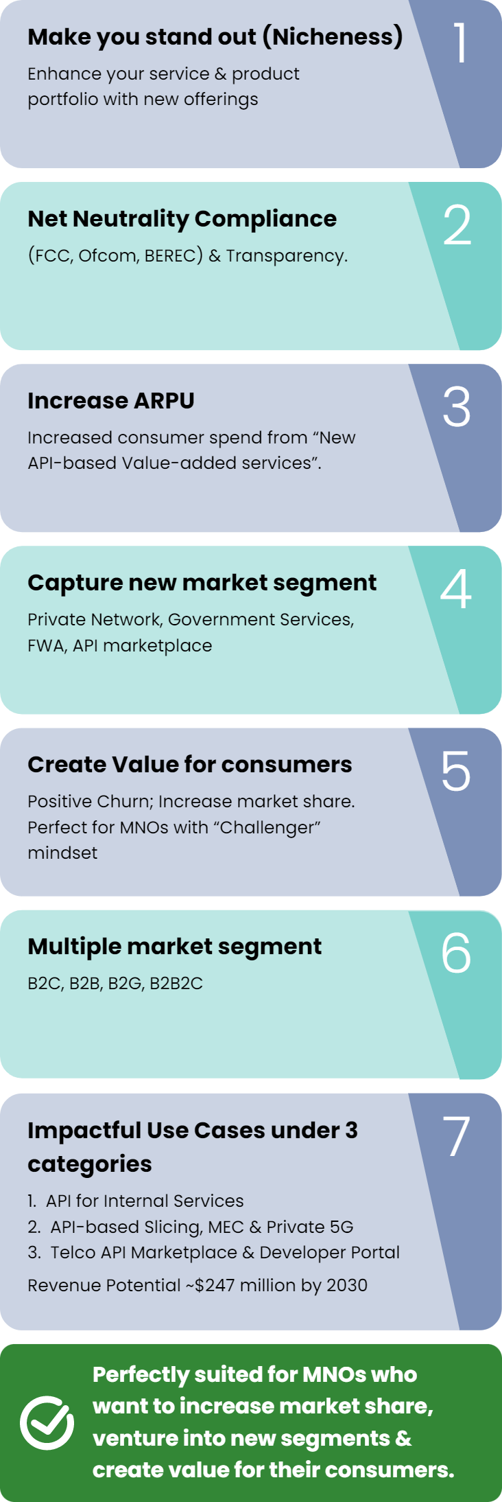 The next wave of telecom growth isn’t about selling more data—it’s about Programmable Networks (API Driven), Service Differentiation (Slicing), and AI Analytics with cumulative value of US$72Bn by 2030. Operators who act now can unlock new revenue streams & reduce costs.