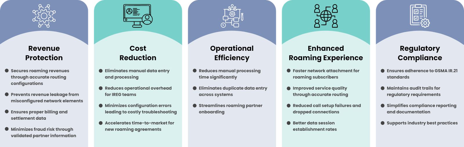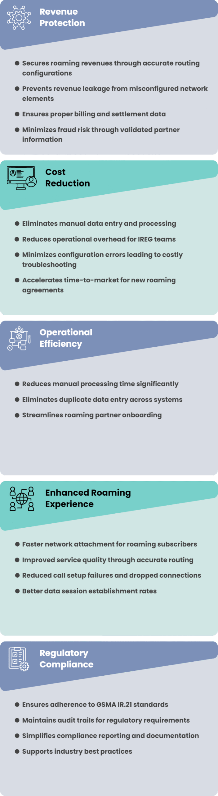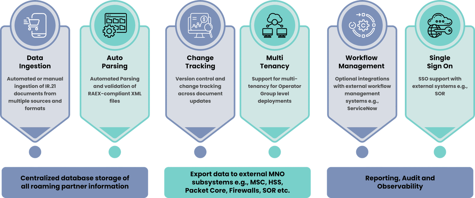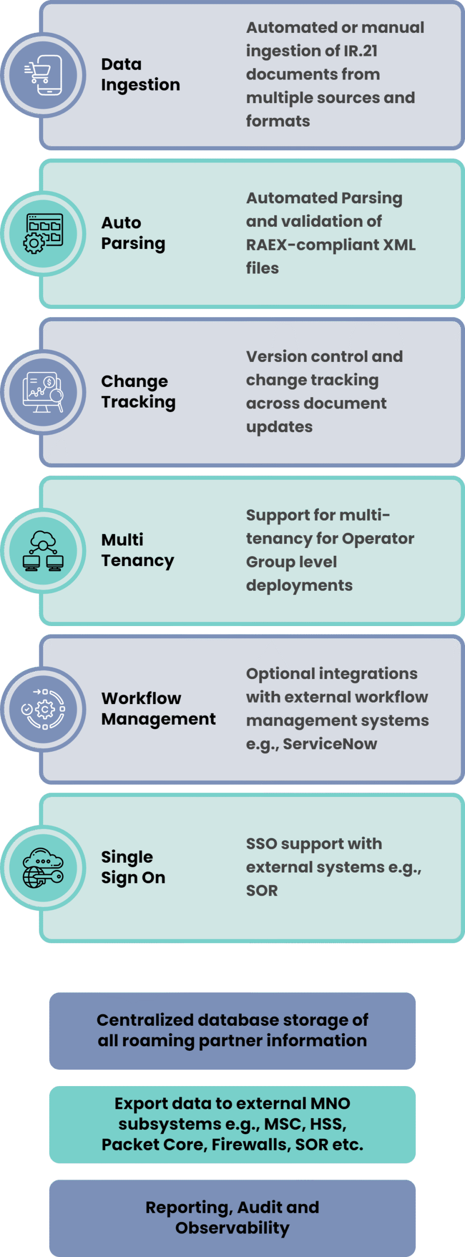 Spartified IR.21 Roaming Database Management System serves as an intermediary layer between GSMA RAEX IR.21 data inflow from partner MNOs and Internal Network and VAS elements, providing automated data processing, validation, storage and export for configuration management